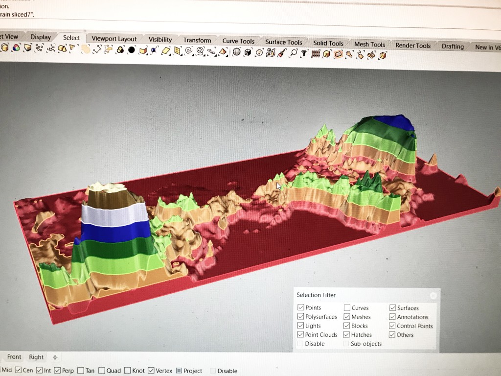 In the cosmogram, the arctic circle of 9000 km where permafrost exist is being the base model where all the information overlay on. Due to the large area included, the height is of the topography is represented in a different scale.