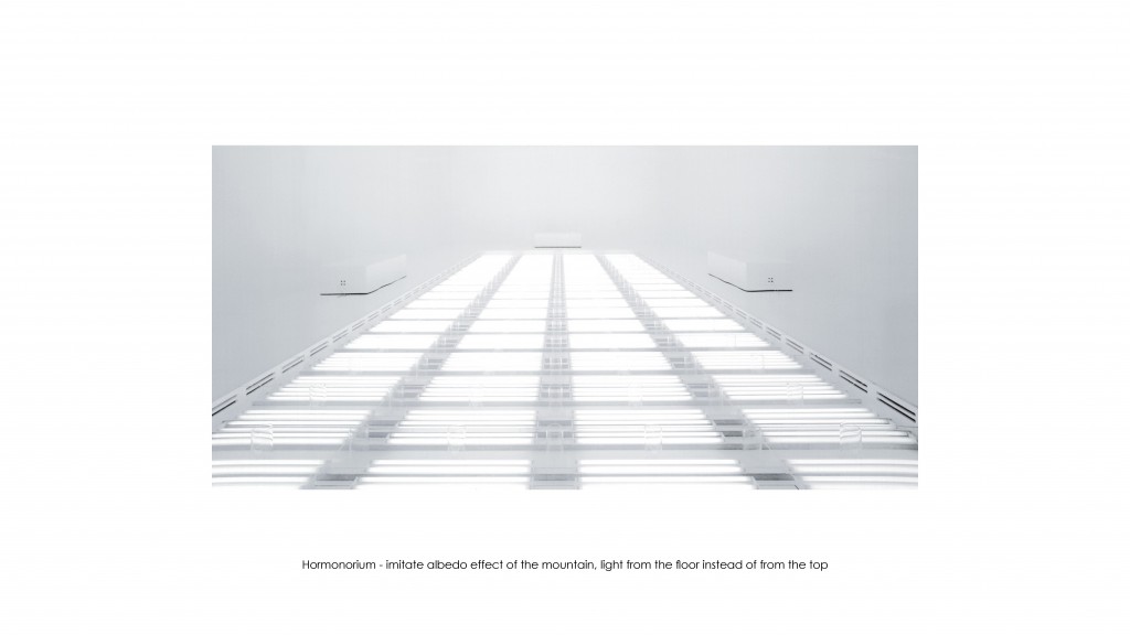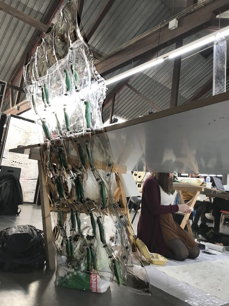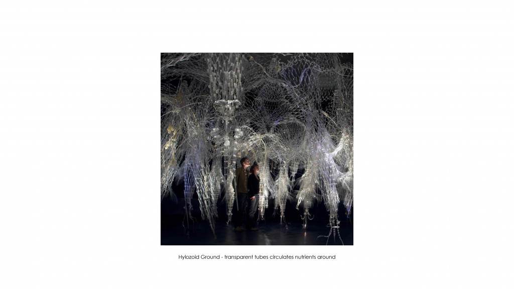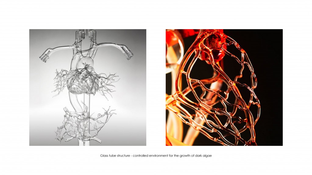 In the next step, the overall arrangement of the cells are being tested. Different options such as folding the surface to form its own rigidity, having a circular interdependent structural relationship and a tensile cable structure that is attached to a loft edges structure are being compared. The two options of shading with pigment and methane gas, whether to use chlorophyll produced by algae to dye the gas or whether to inject methane gas into insoluble viscous solution are both considered.