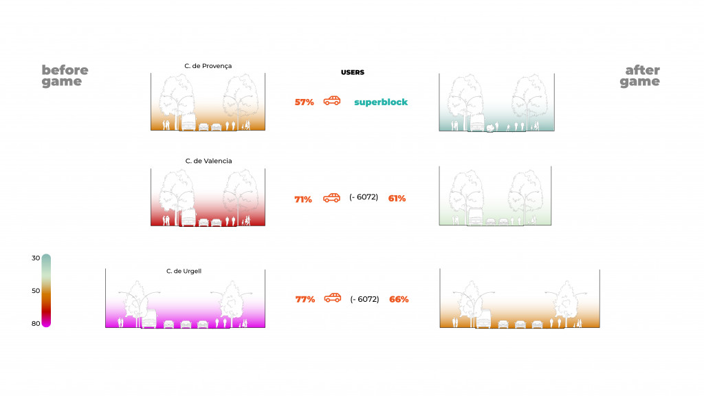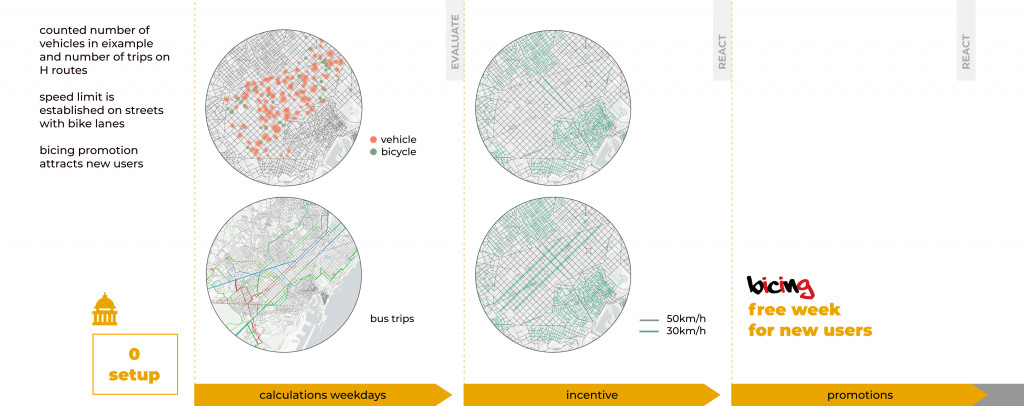 The game consists of setup and rounds. Participants of the game are responsible for different steps and represent top-down and bottom-up approaches. In order to activate SuperBlock, we need 8 rounds (as it is the number of streets we have to transform). Duration of each round depends on how fast participants achieve established objectives. During The setup government calculate existing number of cars and bicycles in Eixample and number of trips made on H routes. In order to provide safety and motivate bicycle usage we pacify streets with existing bike lanes and give 1 free week to attract new Bicing service users.