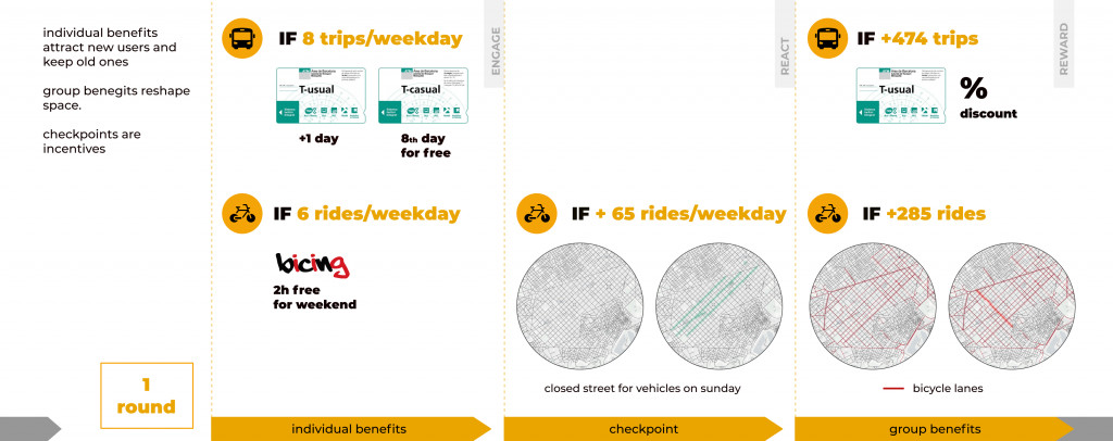 Individual benefits for bus users motivate them to return to bus every new week with providing free ride for different types of cards. Bicycle users will receive longer free usage on weekends if complete week with at least 6 rides. intermediate checkpoint aims to encourage participants and don’t lose motivation. Closed Sundays will allow people who never used bicycle before try it on road free of vehicles. The goal of every round is to achieve specific number of trips and rides for buses and bikes respectively. That number is based on UMP goals of redistribution the ratio of transportation modes. When that numbers are achieved participants receive group benefit and new bicycle lane appears on future superblock street. Bus users get discount for new monthly card. The more people play – less become the price of the card.