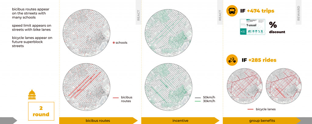 Every new round opens new incentives that motivate people to keep playing. Goals, gratifications and benefits stay the same. Game ends when the all-future SuperBlock streets have bicycle lanes and their speed limit is 30km/h. At the end of the game all participants that followed rules get discount for subscriptions and transport cards.
