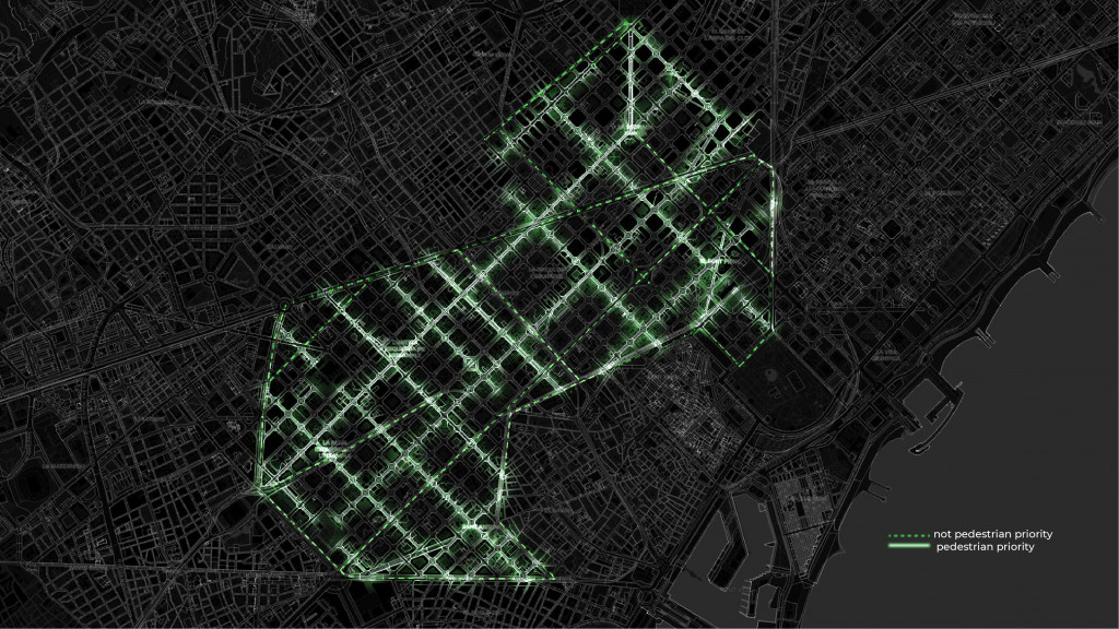 Those goals can be achieved by creating new SuperBarrio in Eixample that establishes greed corridors and prioritizes pedestrians on some streets by completely closing them for private vehicles.