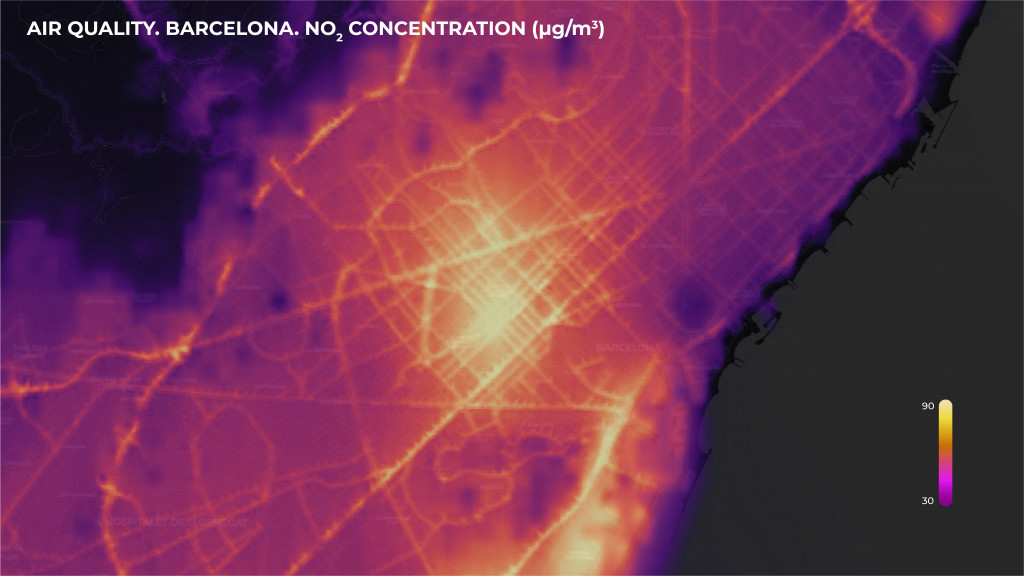 That happens because of most of the movements pass through Eixample as it is the center of the city. We can see how air quality directly depends on number of vehicles on the street. The main streets such as Arago and Gran Via that’s capacity more than 50 thousand of vehicles per day are the most contaminated.