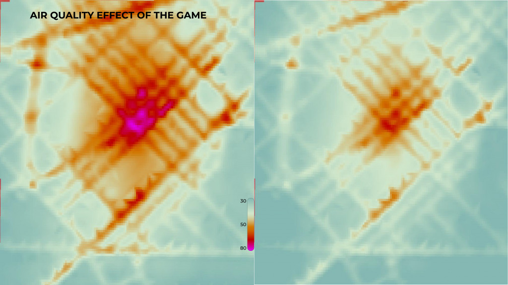 After end of the game number of bicycle rides will increase by 2280 and bus trips by 3792. The effect of eliminating 6000 cars from the street leads to significant reduction of NO2 concentration on one specific street.