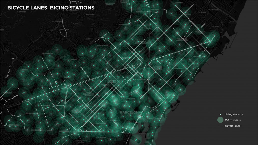 Bicing is a public cycling service in Barcelona and its stations are distributed around the city within 250 m accessibility. However not all cycling lanes are continuing and that among others one of the reasons that stops people from using bicycle. The most popular barriers the absence of Bicing stations in specific destinations, however, as we already talked, 250 m radius of accessibility covers almost whole Barcelona.