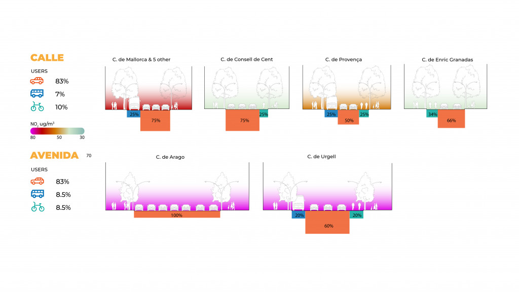Streets were classified in 3 different types according to spatial parameters, noise and contamination levels. The most polluted central site is represented with 2 of them. Contamination level of those streets varies depending on number of lanes dedicated to different types of users: bicycles, private vehicles and public transport. In this way, spatial occupation also becomes a mechanism that can be used to manage air quality.