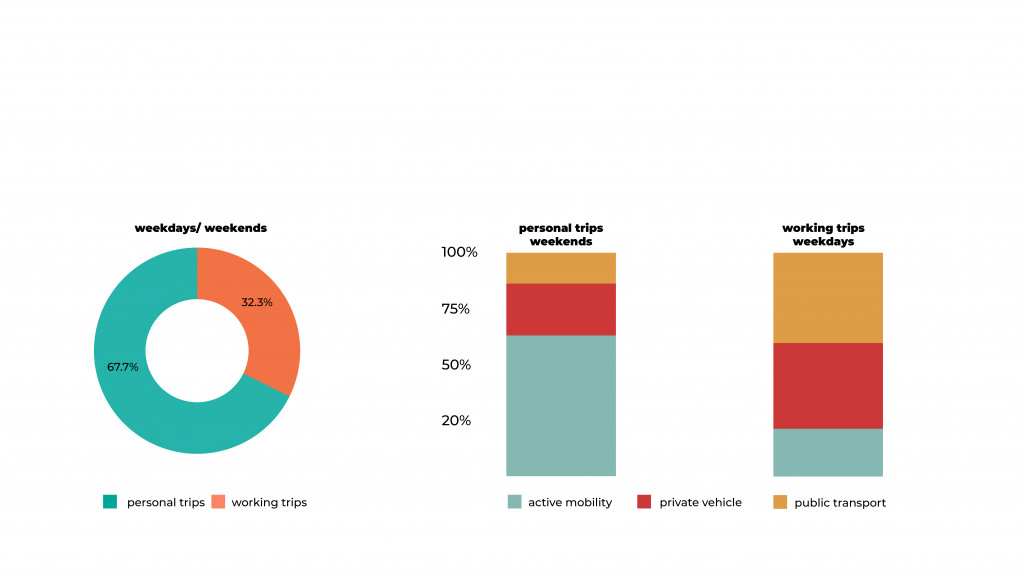 But in order to understand how to motivate people change mode of transportation we firstly analyze existing mobility trends. The major purpose of using cars is working trips during weekdays. So, we will focus on decreasing that number by promoting public transport usage.