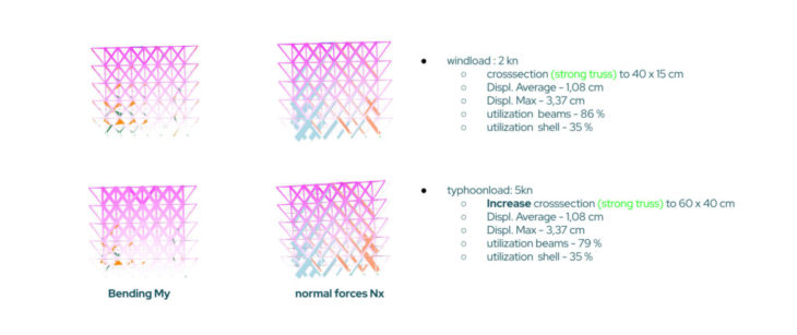Typhoon: Increased windlaod to 5 kN / m² showed that only increasing the “strong truss” helped the structure to sustain. 40 x 15cm – Utilization: 189 %., 60 x 40 cm – utilization: 79 %