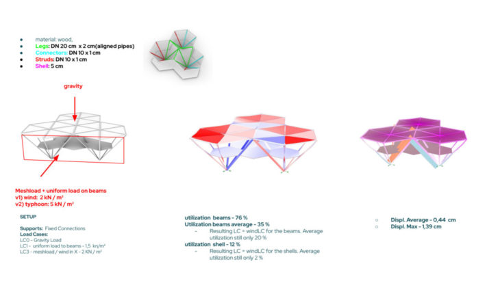 conclusion micro: through this process we were able to proof different module types to be way more stable and therfore more typhoon resilient as a standalone. arraying them vertically and horizontally decreased the general (not average) utilization by 30 % and the displacements by 58 %. therefore we started to take our basemodule and the fittest champion to the mezzo scale for further testings.