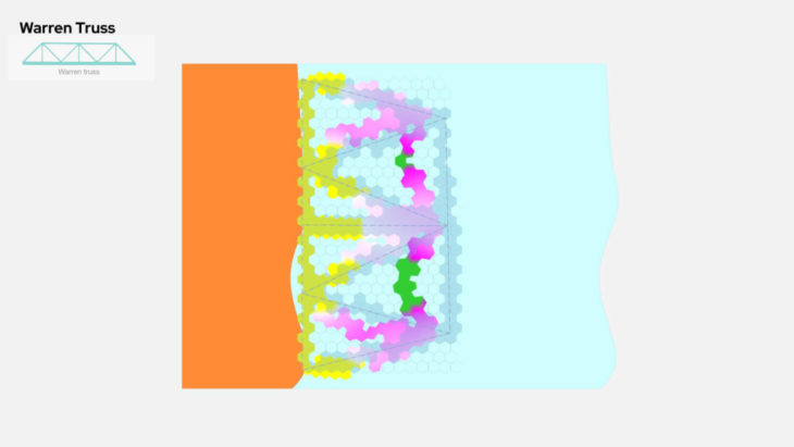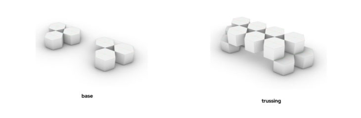 investigation: continuous truss through three hexagons shifted, Stability 4 m truss effect within the structure, Connectivity of subtrusses, Create stable footpoint, Use trussing effect on the badjao cluster, possible use cases is stacked housing or boat bridge.