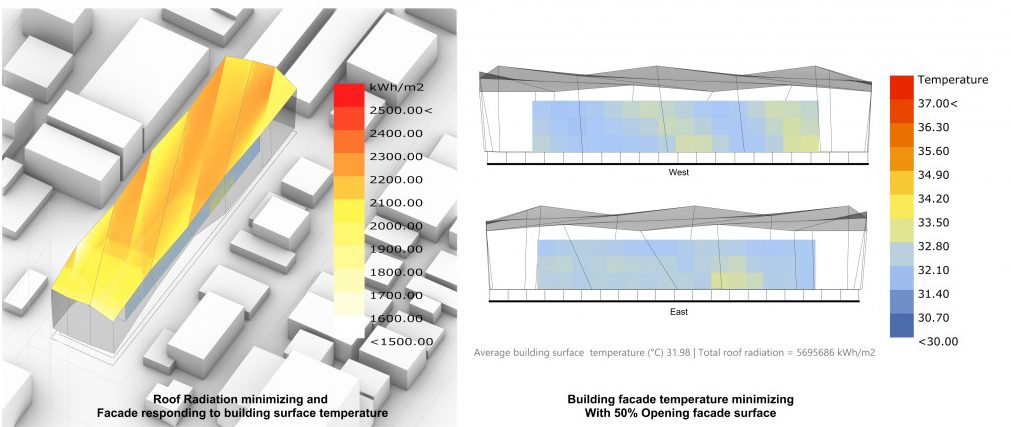 To reduce temperature based on our design principles, the strategy is a combination of roof solar radiation and façade forming to reduce inner box temperature and solar radiation at the same time. In this case, the algorithm could achieve the optimal solution with lowest temperature of inner box surfaces.