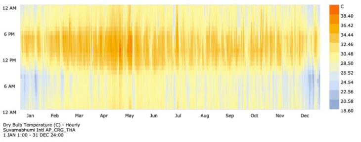According to the climatic data research from Ladybug using EPW data from Suvarnabhumi Intl’ Airport, showing the maximum average Dry Bulb Temperature appears in between April and May while the minimum average is in January and December. During the afternoon from 12PM to 6PM, the temperature constantly stay around 32 to 36 degree Celsius. Then decreasingly reach to 30 degree during the night and morning time.