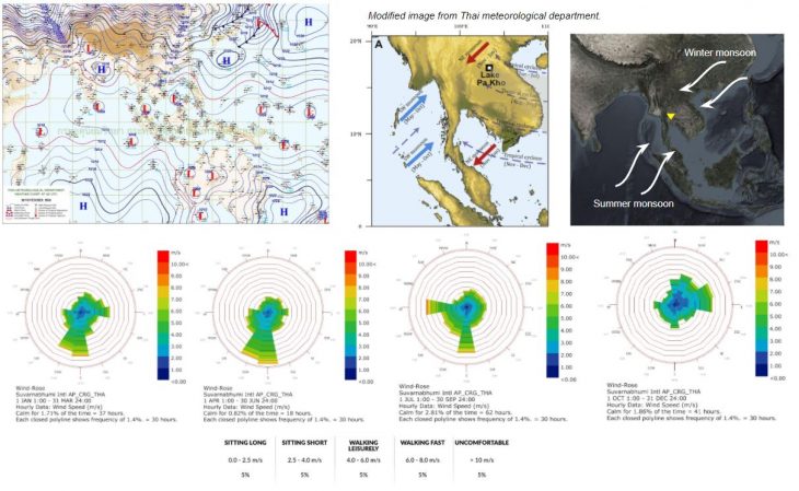 According to Thai meteorological department and Ladybug data, showing that during Summer, the wind direction flow mostly from South and West(Oceanic). While in Winter, Oct – Dec, the wind mostly flow from the North (China and Vietnam). As the wind cannot flow directly from the North due to mountain side that geographically located along the border. The wind that come from the South mostly has a warm temperature and it also brought humidity from the ocean. The wind that come from the North is has the colder temperature which help reduce heat.