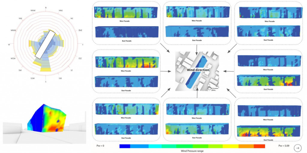 To use the data, By overlaying the wind pressure of 8 different direction and implement the pattern openings according to the pressure values happening on the façade (where Max pressure (red) are the most opening area and decreasing to minimum opening area on the low wind pressure) it allows us to know the location and define sizes according to the data.