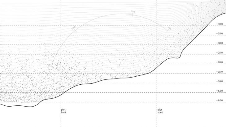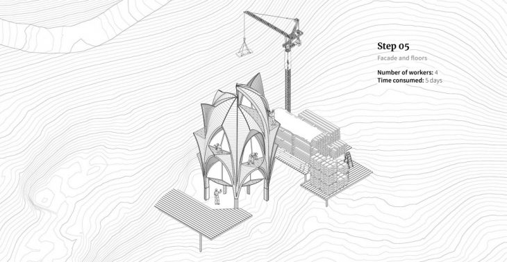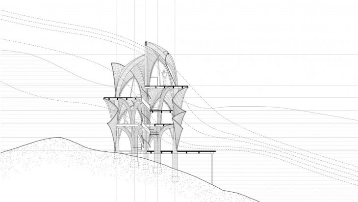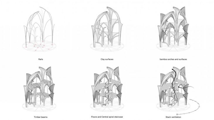 The building is shaped by rail curves that define the arches. They shape the primary structure of 3d printed clay. Then, angled bamboo arches and surfaces shape the facade and provide shading. Timber beams are connected to the arches to support the floors, and a central spiral staircase unites them. We take advantage of stack ventilation, bringing the cold air in through the woven bamboo and out through the staircase and the top openings.