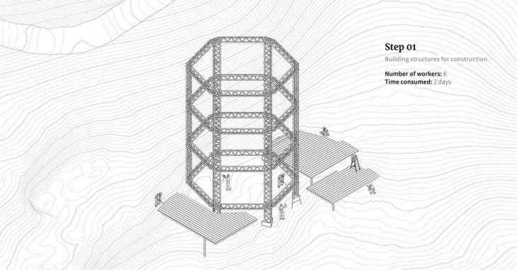 The construction process starts with setting up the structure of the printer and the material storage decks.