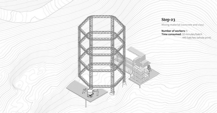 In production, the first step is printing the clay arches and walls. The printing process lasts around 12 days, demanding pauses for drying between every floor.