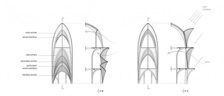 The north facade doesn’t need as much shading, so it is more open while still having some woven bamboo for permanent ventilation. The south and west facades have longer overhangs for solar protection. The bamboo arches that are angled inwards have a loose woven bamboo surface for permanent ventilation.