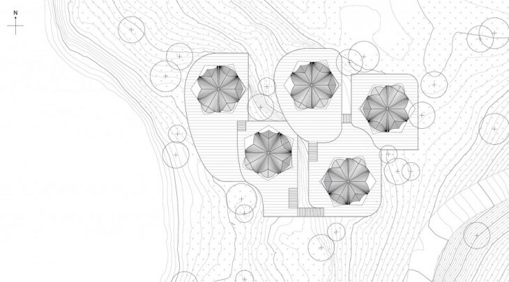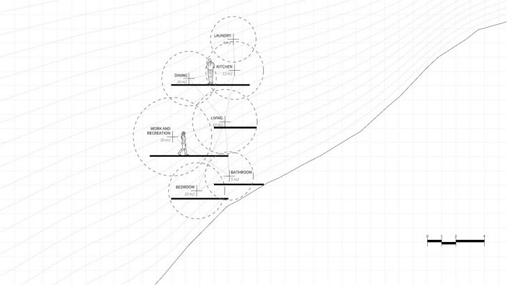The units are designed for two people who enjoy living close to nature. On the next level, there’s a bedroom integrated to the bathroom. These are the only rooms with walls, since they require some privacy. They face north-west, requiring a lot of shading but also getting most of the ventilation.