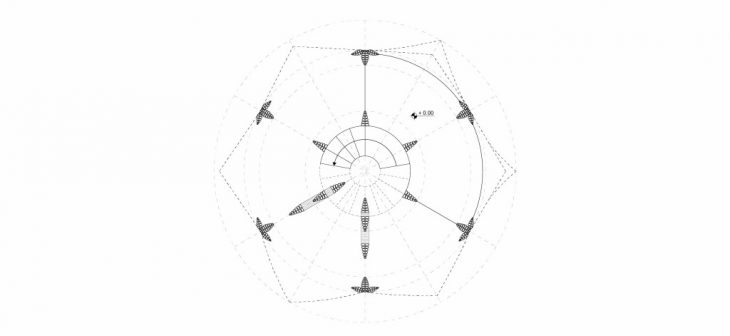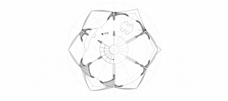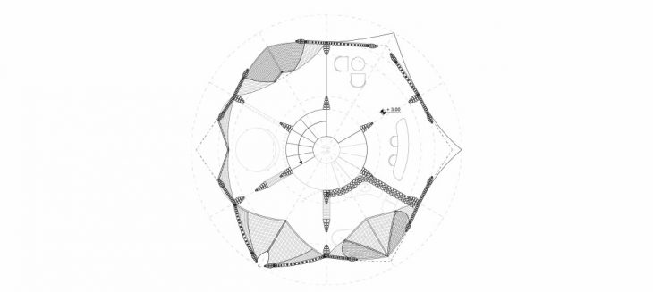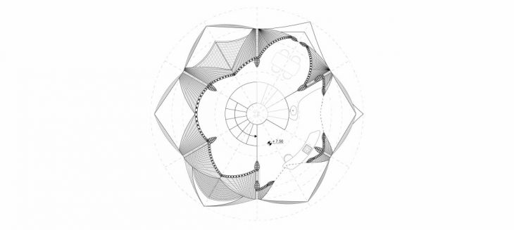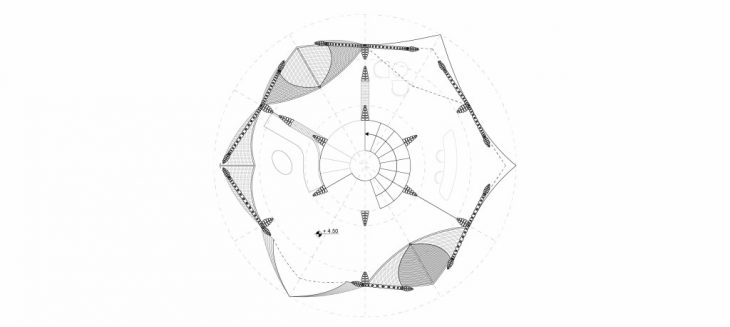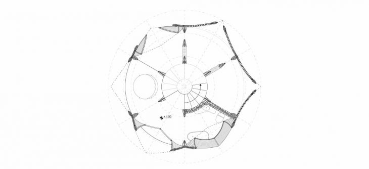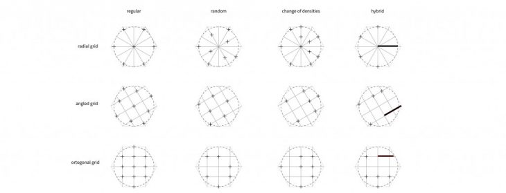 From the robotic system chosen we study several structural grid strategies, based on a radial, an orthogonal and an angled grids. A regular radial grid is ideal for our system, making it possible to centralize columns where the arches branch out from.