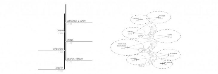kitchen and laundry which are the most humid areas are placed on the top to avoid bringing the humidity inside the building. The visibility and ventilation between floors is unobstructed.