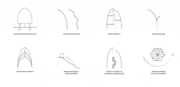 To deal with these challenges we explore some design strategies to ensure permanent natural ventilation, structure being elevated to avoid contact with the soil to protect from its humidity, and increase the surface area of the outer surfaces in order to reduce the temperature gain. different shaded openings and permanent ventilation strategies for each orientation. Taking advantage of slope ventilation which follows the stack ventilation within the structure.
