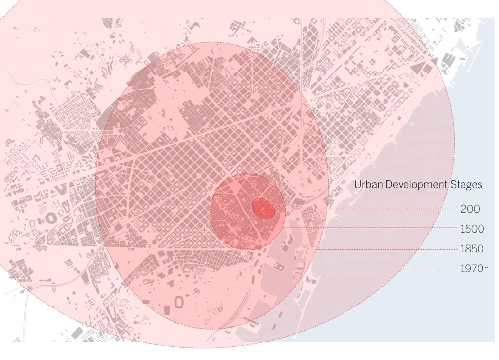 Barcelona, as the well-established center of the Catalan region, is a city built upon two thousand years of consecutive development. Given this general circumstance, we found that if we are to determine the unique feature of Barcelona’s touristic charm, it would be necessary to first understand the formation of the city’s past urban development. As the following set of maps will indicate, the the city’s various layers of historical transition have left a visible impression on the city’s urban organization, particularly in the obvious difference of the street patterns in its most iconic districts.