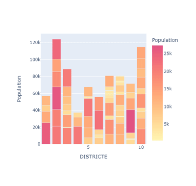 @app.callback( Output(mygraph, 'figure'), Output(mytitle, 'children'), Input(dropdown, 'value') ) def update_graph(column_name): # function arguments come from the component property of the Input print(column_name) print(type(column_name)) import json with open('..BCN_Analysis4326-trial2.geojson') as f: Barcelona = json.load(f) fig = px.choropleth_mapbox(df, geojson=Barcelona, locations='BARRI', color=column_name, color_continuous_scale="pinkyl", mapbox_style="carto-positron", zoom=10, center={"lat": 41.3874, "lon": 2.1686}, opacity=0.5) return fig, '# ' + column_name@app.callback( Output('table', 'figure'), Input(mygraph, component_property='selectedData'), Input(dropdown, 'value') ) def update_side_graph(slct_data, column_name): dff2 = df.copy() # Filter Barrios ids if slct_data is not None: slct_ids = [] for pt in slct_data['points']: slct_ids.append(pt['pointIndex']) dff2 = dff2[dff2.BARRI.isin(slct_ids)] fig2 = px.bar(data_frame=dff2, x="DISTRICTE", y=column_name,color=column_name,color_continuous_scale='pinkyl') return fig2