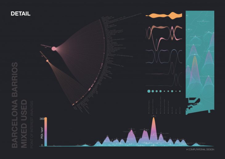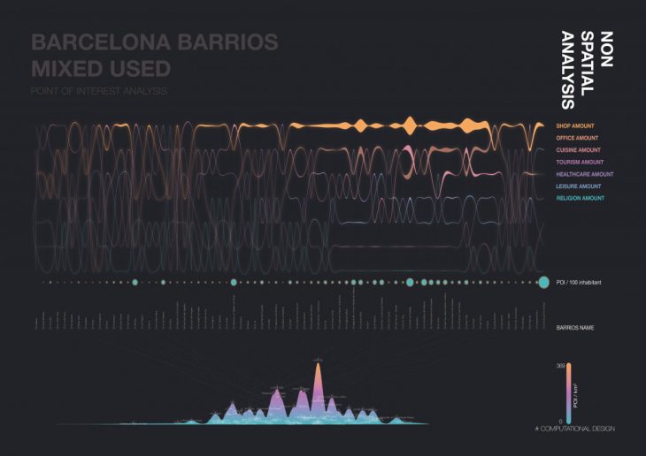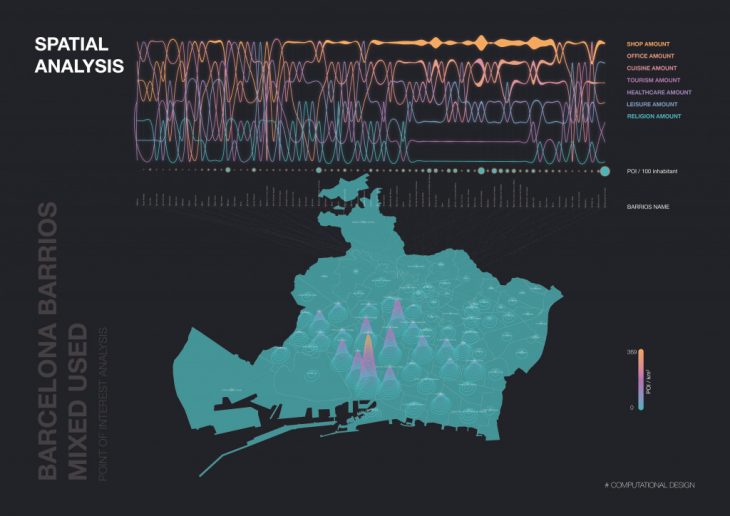 Learn about the mixed use of the neighborhood scale in Barcelona through the distribution of points of interest. The functions are mainly divided into seven categories for analysis. Shop, office, cuisine, tourism, healthcare, leisure and religion. Combining spatial and non-spatial analysis of data.