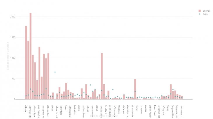 By using the scatter plot plugin through QGIS, we are able to analyze the different price and quantity of listings in different districts of Barcelona. Which is then used to compare it to the prices of rental by the top 10 multi-hosts.