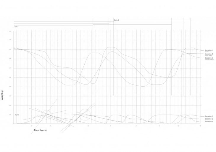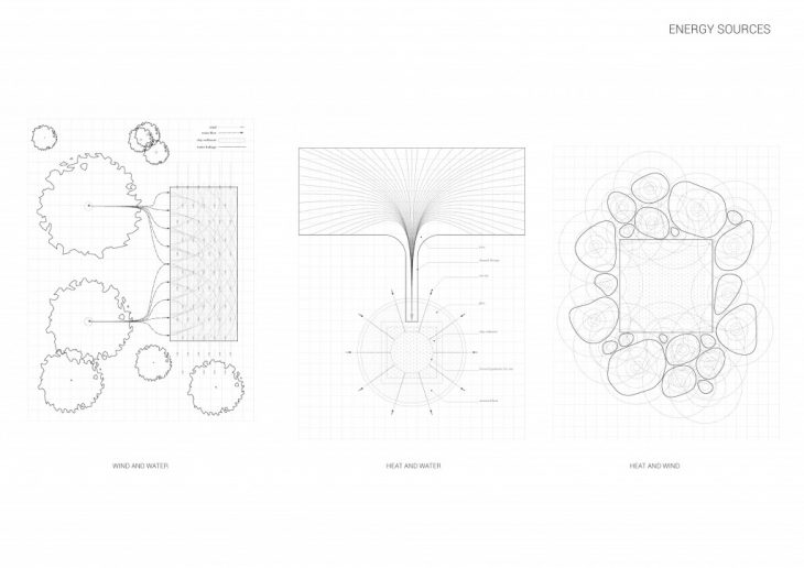 We searched for locations within the urban context that mirrored the energies of the natural locations. These locations visualize the energy surrounding the place and inside it. It is affected by time, space, and natural forces (wind and heat to generate the de-humidification of the material). The drawings indicate the many complexities of the energies surrounding the space that we may not see.
