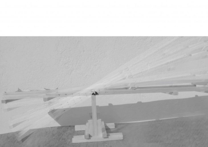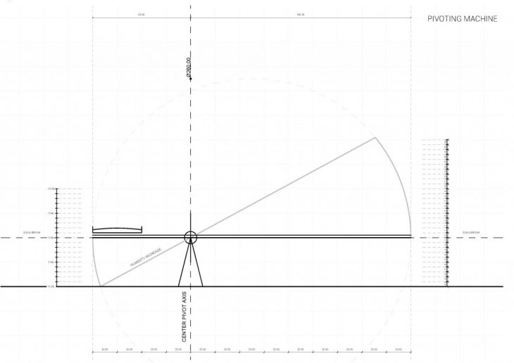The design focuses on the cyclical process of humidifying and drying the material through this pivoting machine. The pivot works with the clay on the shorter end as a counterbalance for the weight of the longer end of the machine. The offset pivot maximizes the rotation distance, so the visible movement. Requiring no active energy input apart from the environmental forces which dry the clay, it purely reflects the energies of its location.