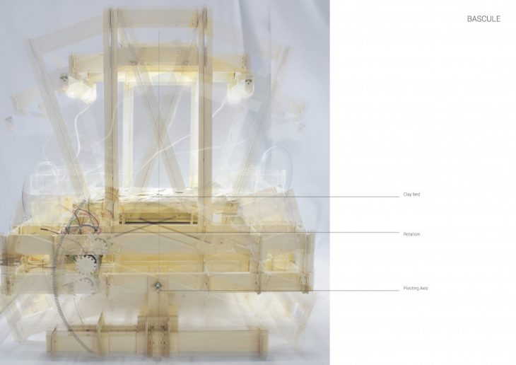 In combination with materials that can hold onto the clay, containing it, a machine can emerge. The development of geometry and materials is focused on amplifying the visual and physical changes in the material, and integrating energy sources.