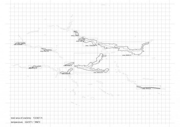 Analyzing the cracking area through the image reveals how the humidity escapes the clay. Mapping the cracking spread (its area) to a timeline allows us to understand the rate of cracking. Heat accelerates the drying process. The visual change is much more enhanced with the energy source that the clay is in contact with. It is important to take into consideration the possibilities of how the clay dries and how that visual change is documented.