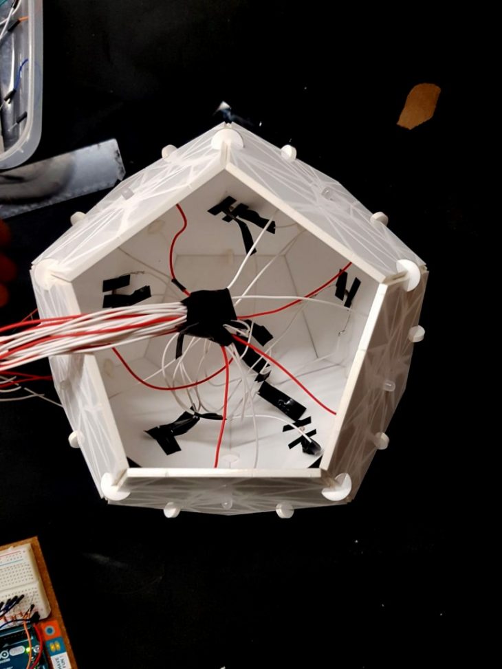 BEATBALL captures the illumination data of the space and allows you to interact by shadowing each of the 6 light sensors. The photocell sensors correspond to an individual sound and light effect. The code is written in #Processing where the visualization is created by mapping the location of each point of interaction with a triangulation projected on a sphere.