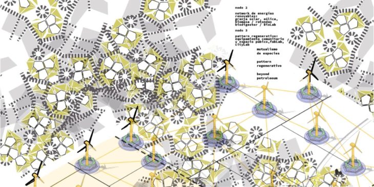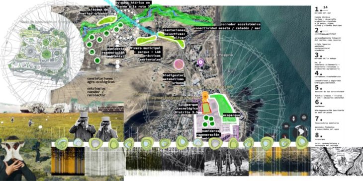 Nuevos patrones eco-habitativos y eco-programáticos generan superficies activas, de infiltración “in-between” regenerativa entre los pozos con y sin abandono técnico, reformulados como redes de provisión de energías alternativas y sumideros de drenaje. Estos paisajes tecnológicos resultantes de los antiguos enclaves mineros petroleros mutados a un nuevo ciclo de vida util definen el denominado Espacio Agrario Costero Periurbano, un modelo alternativo de planificación urbanística y territorial, basado en la creación de una relación simbiótica de reconexión entre el mundo rural y el urbano.