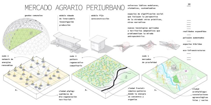 Nodo mercado del agua y de las colectividades + huertas comunitarias + biolab/ecolab/farmlab + feria intercambio plantines / vivero + rotonda biodigestor aguas grises + cpb + nodo habitacional – patterns de organizacion nuevo parcelario + nodo energias alternativas.