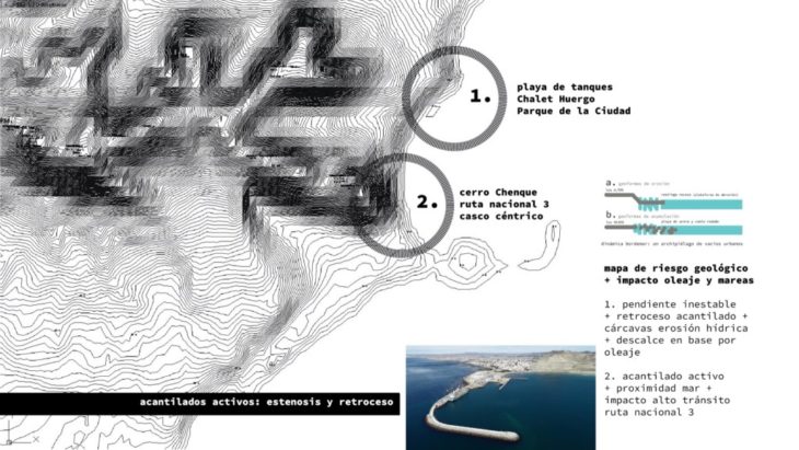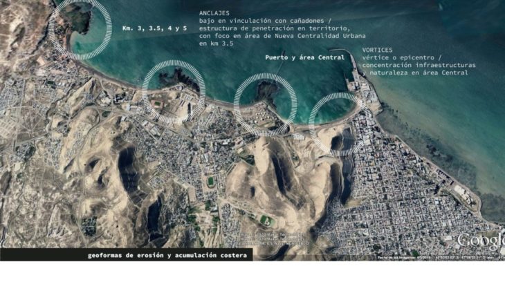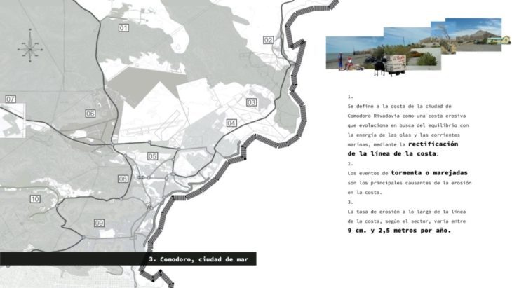 Para ello propone la reconversión del frente marítimo de la ciudad de Comodoro Rivadavia centrando su enfoque en la reconfiguración de los vacíos urbanos resultantes de la industria petrolera, reformulando la restricción que impone la trama de pozos sin abandono técnico con una estrategia de remediación sostenible y de definición de una nueva estructuración parcelaria, revirtiendo la fragilidad ambiental, la rigidización en las relaciones ecosistémicas con el soporte natural, la precariedad y distorsión de un hábitat inmobiliariamente voraz y no planificado.