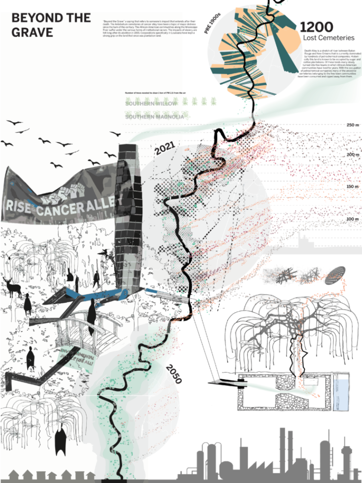 the land and the people. Artificial air filtering trees along side known burial markers like Willow and Magnolia trees will populate these revitalized memorials in which the commemorated will feed back into the health of the land.