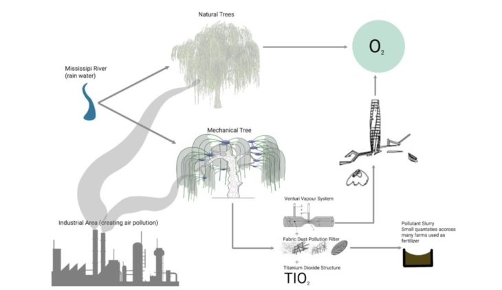 Returning the land to the people of St. John the Baptist Parish would be the start of progress, but introducing environmental aids would bring life back. In order to combat air pollution a system of artificial, mechanical trees would be implemented in order to eliminate harmful PM 2.5s and other harmful contaminants.