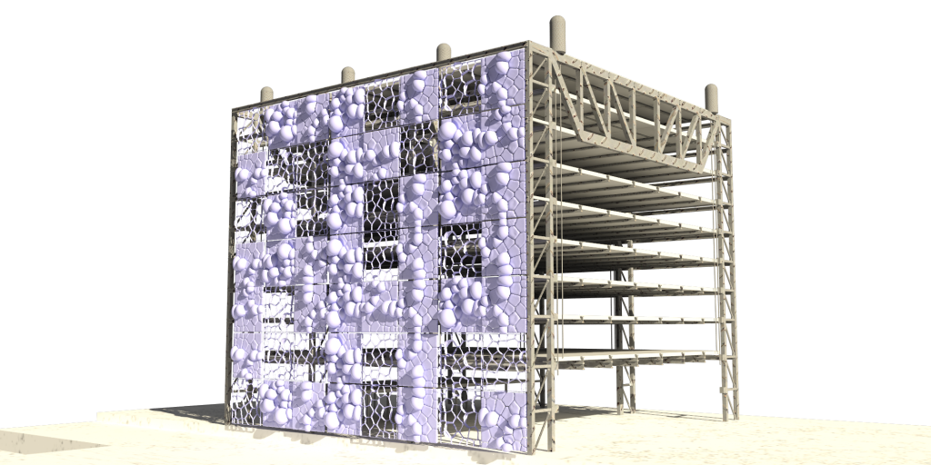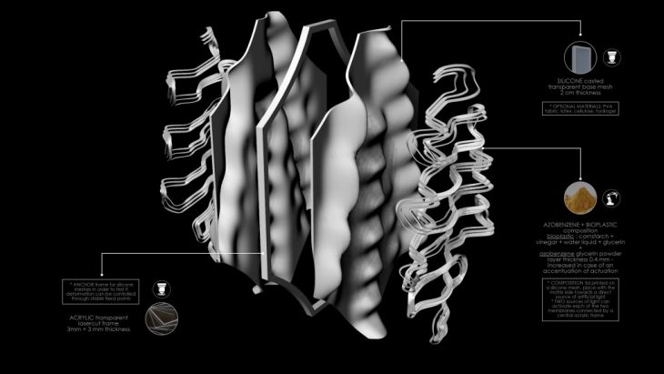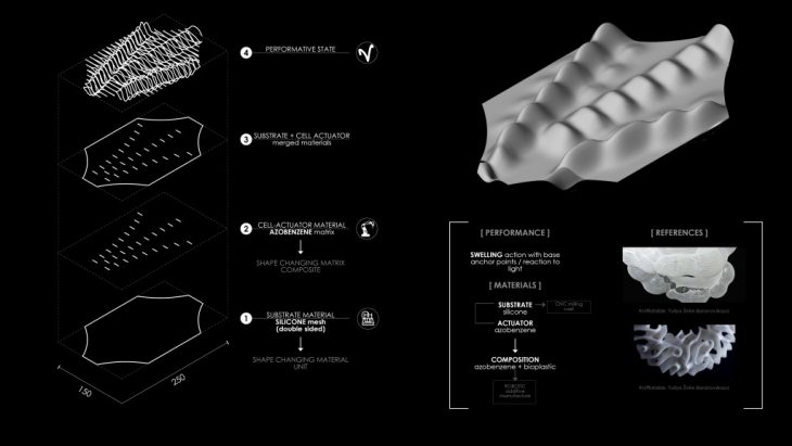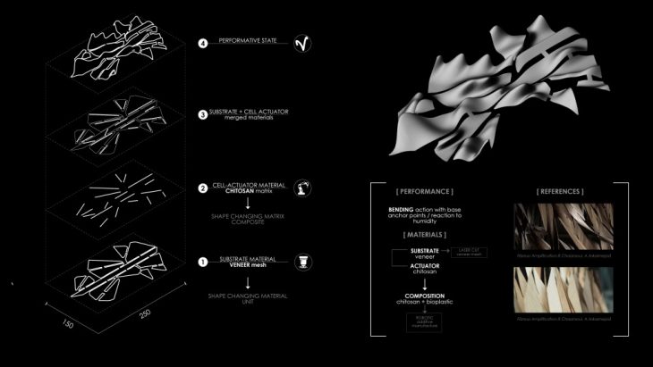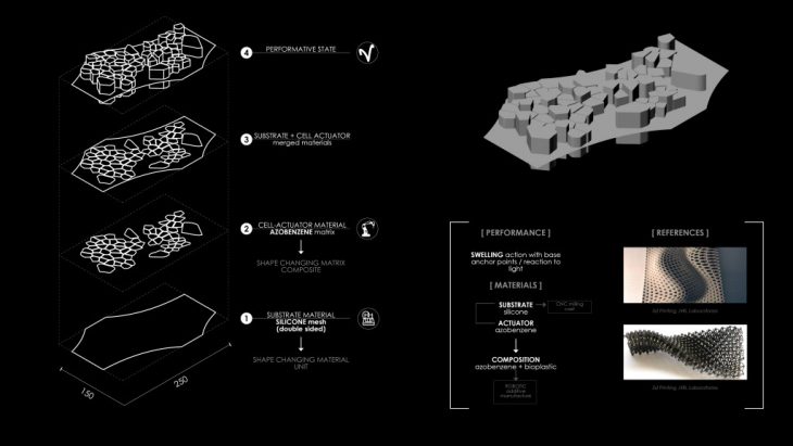 The final proposal focuses on a shift in materiality: a base unit of bioplastic and a 3d printed activation matrix composed of bioplastic+chitosan. The final shape proposal is based on simulating an inflation behavior, which in this case can become a performative architectural component, that inflates and bends in accordance with humidity fluctuations.