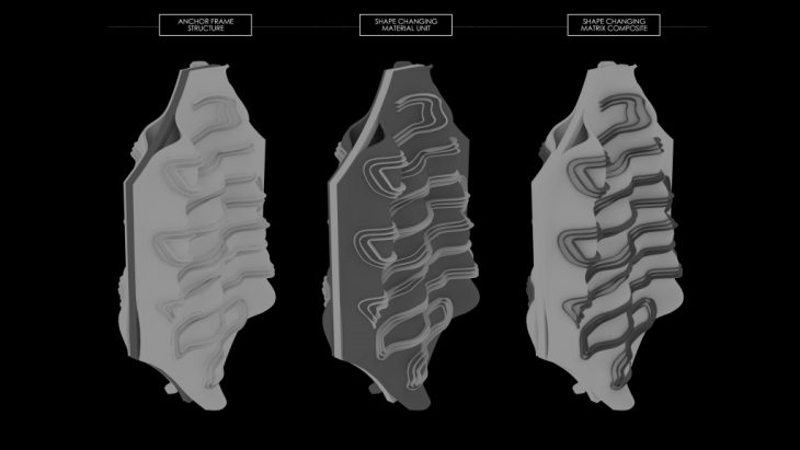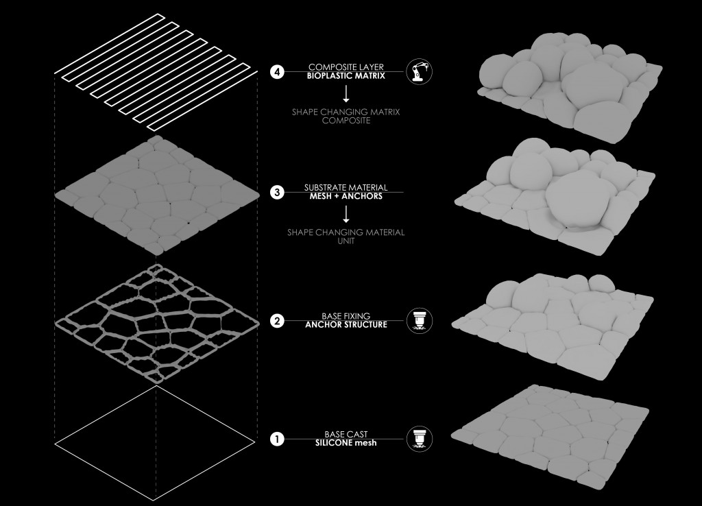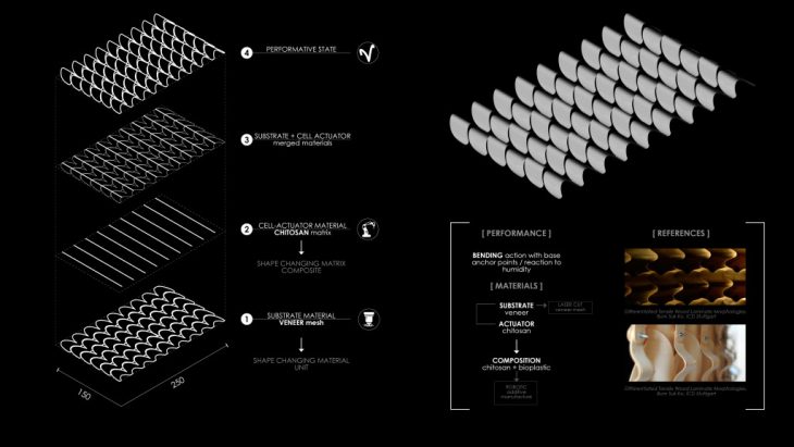 The optimization process looks at simulating the swelling reaction through using a flexible base material (latex,silicone) achieved through mold casting by CNC milling and an activation matrix composed of a bioplastic + chitosan mix, that will be 3d printed with a robotic armĀ  using an End Effector Syringe extruder. The bio-matrix would react to humidity and therefore will produce movement and bending to the base unit, creating a series of dynamic shapes and deformations.