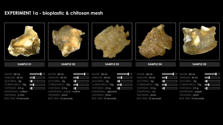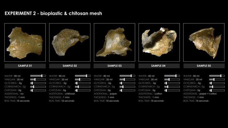 Phase 2 of the project focuses on developing the biological formula that would allow for experimentation with bioplastics and chitosan in order to achieve a shape changing material. In this case, 2 recipes are tested, both including the same components, but with different quantities. The formulas consist of: water, vinegar, glycol, cornstarch (for bioplastics) and an addition of chitosan for response to different levels of humidity. After creating a set of 10 different bioplastic meshes, the experiment tests how the recipe would work if applied as a matrix to a base material. As a result, the matrix becomes successful only if applied to thin bases and with higher layer height.