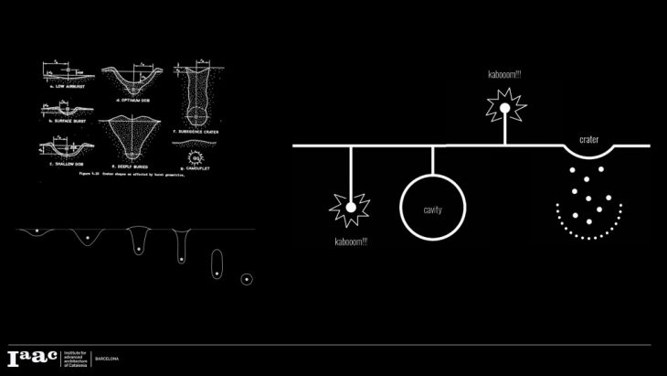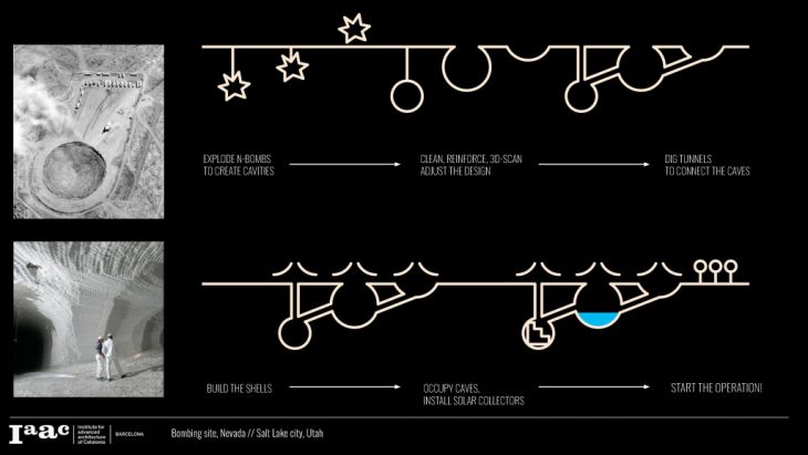 The mechanical excavations on the Moon are quite a challenge, so we suggest that we should blow a series of nuclear explosions on and under the Moon surface, creating craters and caves. The low gravity will ensure that the caves, created by the compression of the regolith, won’t collapse under its mass. They will be further cleaned, 3d-scanned and adapted for the ice and water storage, solar panels and battery production and storage.