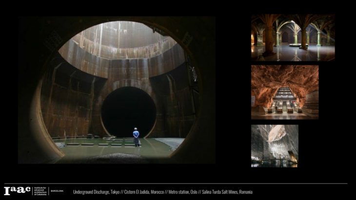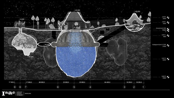 The water tank cave is not merely a storage. The process of the ice melting and the purified deactivated water falling down in big slow drops is to become the major aesthetic attraction for the settlement, the monument to the source of life and impressions.