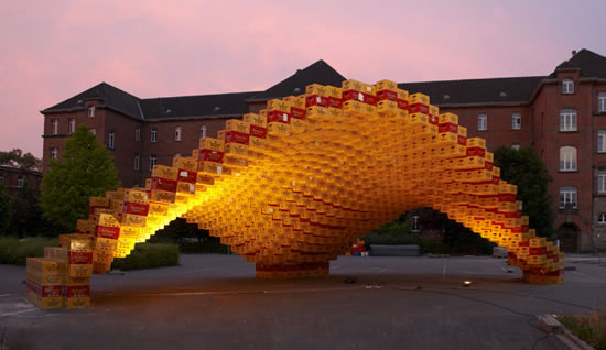 The building shape is based on a minimal surface and consists of more than 2.000 beer boxes that are organized along the free form geometry. The temporary construction was designed using parametric software to control the position of the boxes in relation to the overall geometry and to analyze the structural performance.