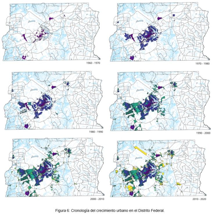 Así, como se puede observar en la secuencia de imágenes, el crecimiento del Distrito Federal, donde se encuentra Brasilia, se desarrollaba en las regiones periféricas, pero sin ningún carácter independiente, ya que el comercio y los equipamientos públicos y privados se instalaban en la región central de Brasilia.