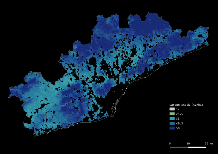 Our first step was to calculate the current crops’ carbon stock. We started from a dataset from SoilGrids, but due to its inaccuracy, we performed a linear regression with the NDVI, to be able to have a complete result. (This model has a Mean Absolute Error Rate of 0,14)