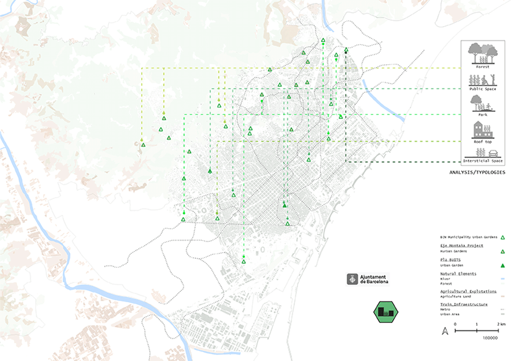 The first elements of this network are the urban gardens. These are parts of the ”Pla Buits”, a co-management project aimed at the regeneration and revitalization of the urban fabric, and the “Eje Montaña” project, which promotes agriculture in the Collserola zone. Moreover, we classified them in different typologies in relation to their context.