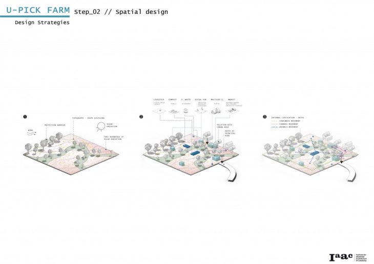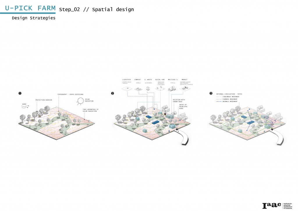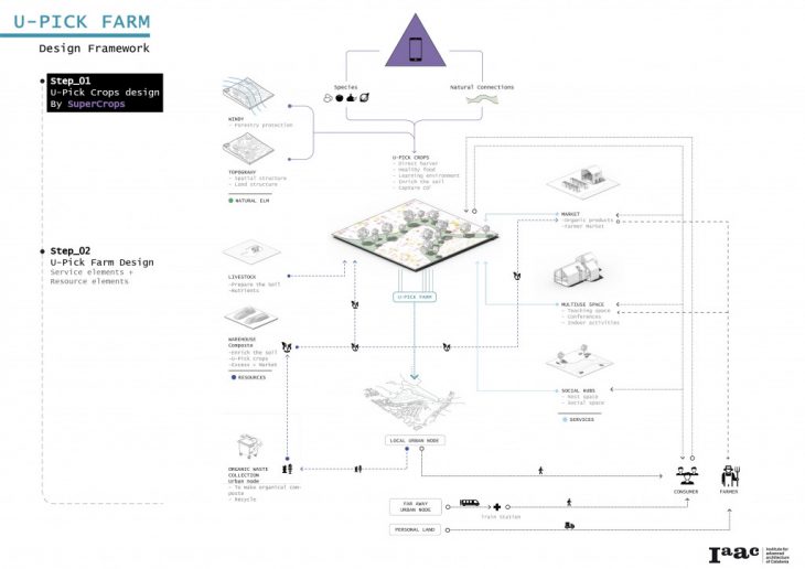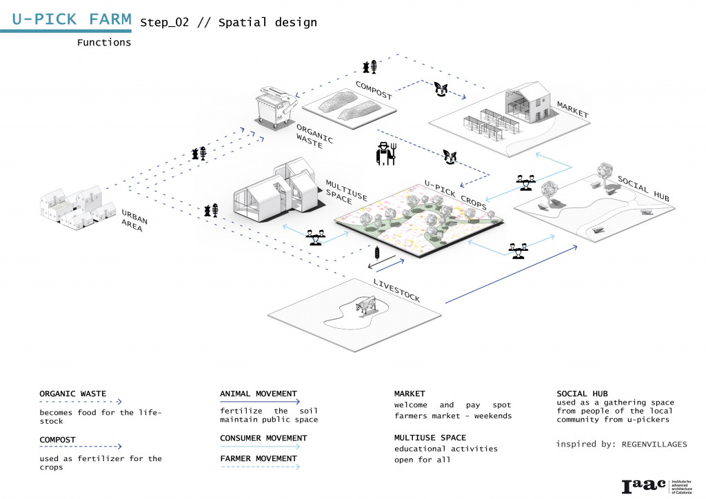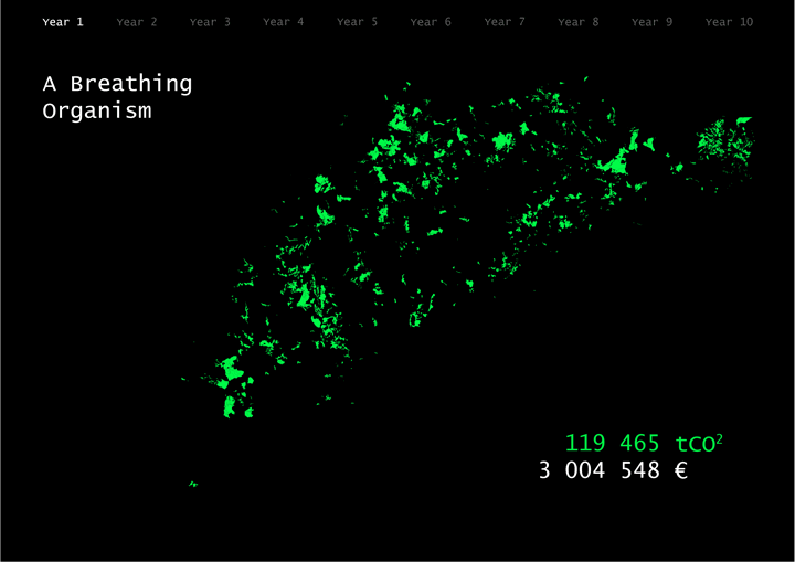 “A Breathing Organism” is a project developed for increasing the Carbon Capture in the area of Barcelona. We consider the soils as a means to achieve that and we propose to convert conventional to regenerative agricultural lands. In this study, we worked on urban and rural scale and introduced a network of U-Pick farms, at the periphery of the city, to connect all the pieces and make them work as an organism. Thus, with the development of this system besides increasing the CO2 capture, we are managing to achieve general health and social benefits. In other words, by supporting the organic food market and connecting the farmers with the consumers, we are enhancing a change in the mentality of the people. Hence, our system is evolving throughout time in a circular way.